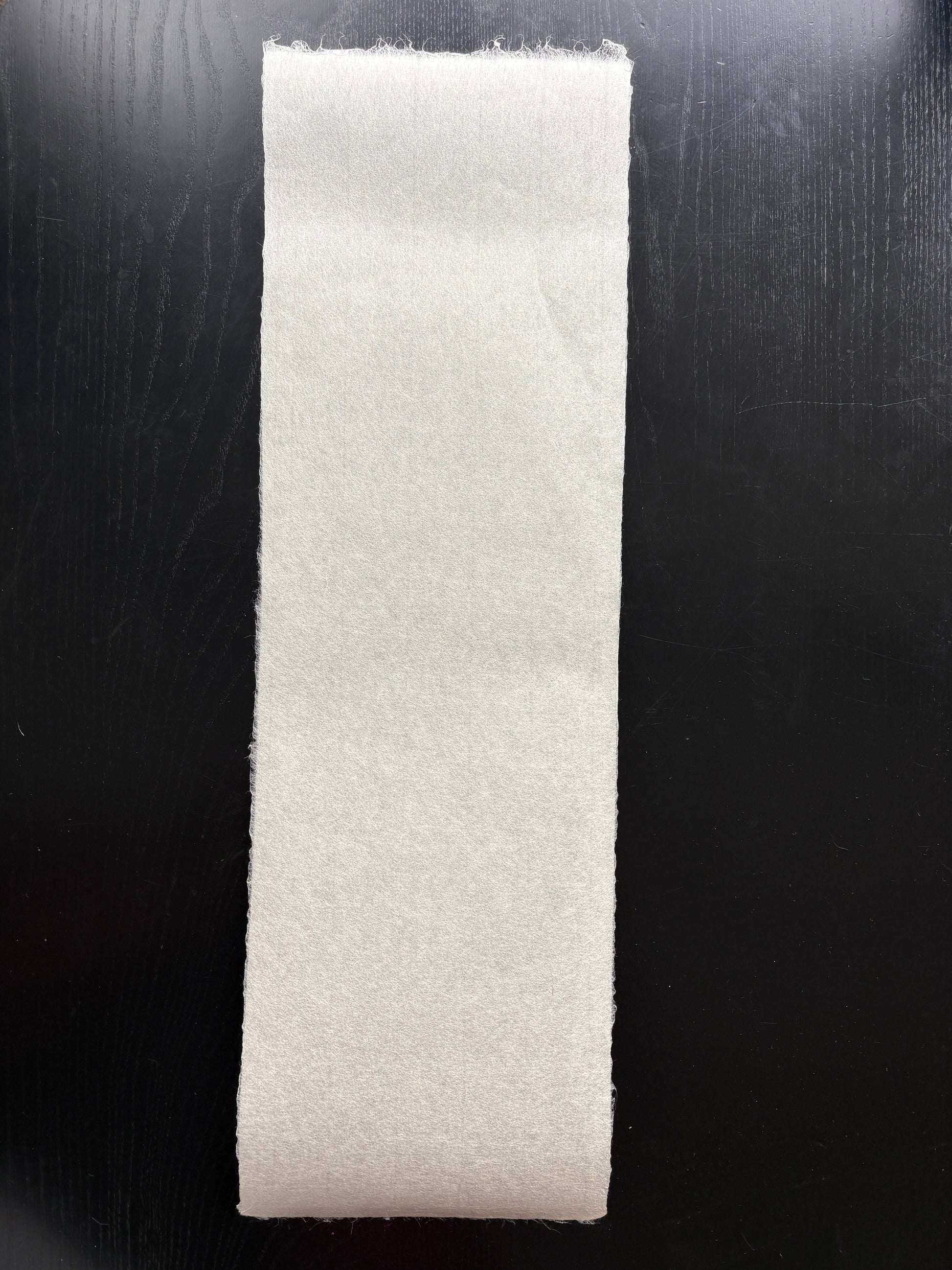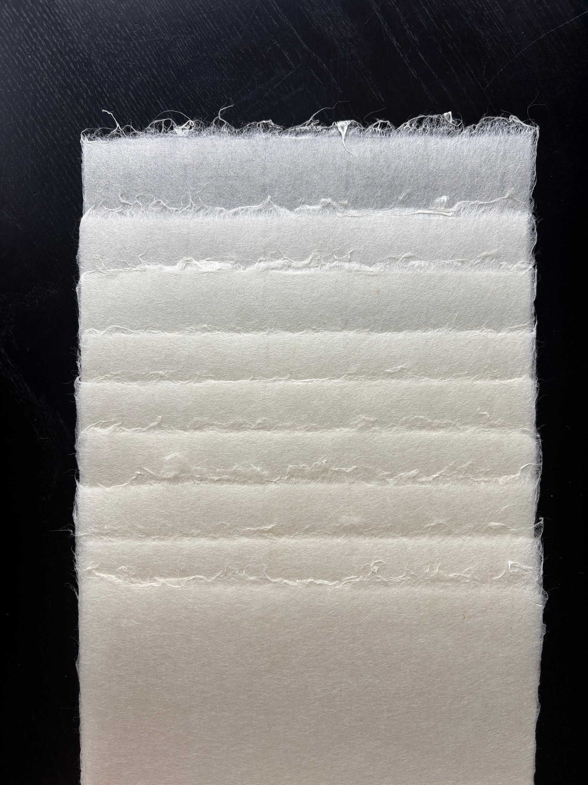 This long format is handmade with traditional papermaking method, unbleached, with deckle edges on all four sides. Heritage washi, produced in Kochi, it's dried on wooden panels so both sides have a slight soft toothy texture. Subtle laid lines are visible.