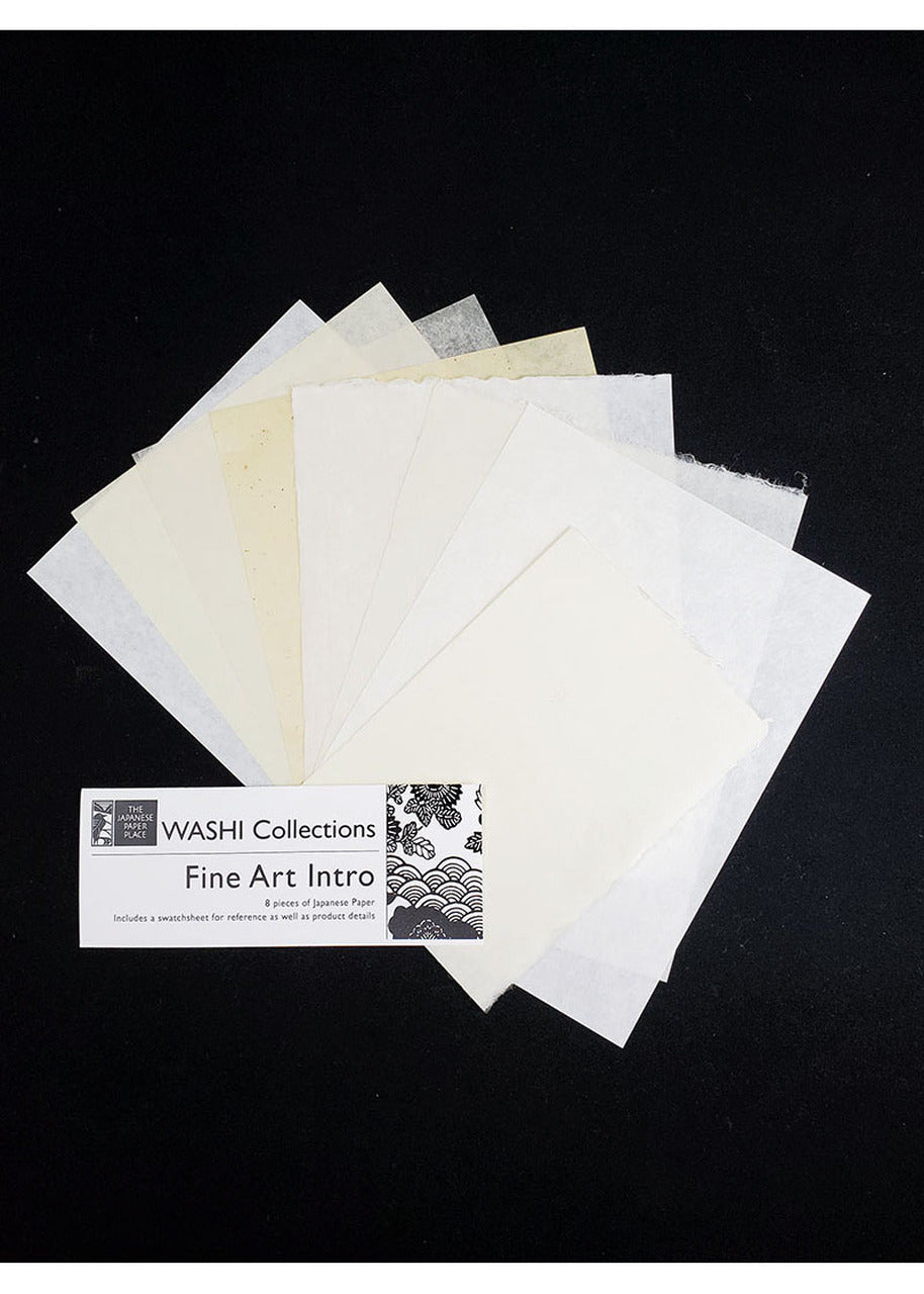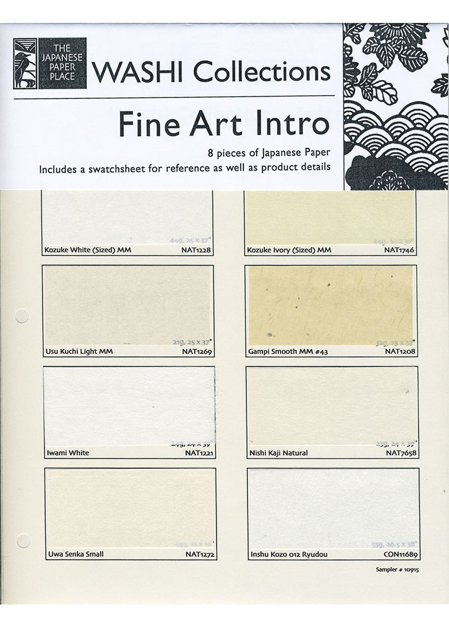 Package includes a swatch sheet for reference as well as technical details of all the papers included. 8.5 x 11" or smaller papers included in this package are: Kozuke white and ivory, Usu Kuchi Light, Gampi Smooth #43, Iwami White, Nishi Kaji Natural, Uwa Senka Small and Inshu Kozo 012 Ryudou.